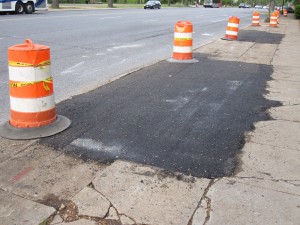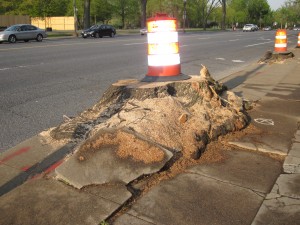 You’ve heard people express regret at not making that last visit to a relative before he or she dies? You wish you had one more picture to help you remember, one last conversation to think back on. I don’t want to belittle that sentiment by using the same language about a tree, but that’s exactly how I felt. The stump must have been five feet across, a venerable arboreal specimen. Besides that, I must have passed it dozens of times since I’ve been walking to my office from a farther away bus stop over the past few months. Wracking my brain as I passed the stump, I couldn’t remember what it looked like. Maybe it was diseased or dying. Maybe it harbored some sort of pests. Or was its only sin breaking up the surrounding sidewalk with its huge roots? Even if that was the reason, looking at the size of the roots and the age of the walk, why cut it down now?