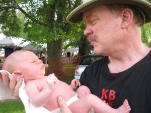 …except for the gent with the baby. I was simply holding him, cuddling my beautiful grandson, and he was just lying there, content and inquisitive, looking at the world around him. We’ve flipped through many calendars since I held our own babies. It has been a long time but like riding a bicycle, it’s something you don’t forget. And being the grandfather, all I had to do was hold him. No other worries. Though I walked around with him plenty that morning, at this ant farm moment I was simply sitting. At first, I felt a little funny not “doing” anything. Usually, I would have been in the thick of it, carrying this, folding that, taking out the garbage and being a busy bee myself. Right then, I was content doing grandpa’s work: holding Rider. It was the only task I was interested in, the best job of all.