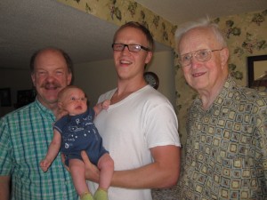 It was a pleasure watching my parents meet their great-grandchild. I found the miracle of my own children’s birth hard to grasp, this first grandchild’s, a wondrous mystery. I think my parents felt thrilled and amazed and possibly a little stunned seeing the child of their child’s child. Honestly, it was hard to take it all in. I loved watching them study Rider, looking at his features, checking, comparing, admiring. And loving. I think the great-grandparents enjoyed and treasured every moment they had with their great-grandson. I know I was glad to be a part of that moment.