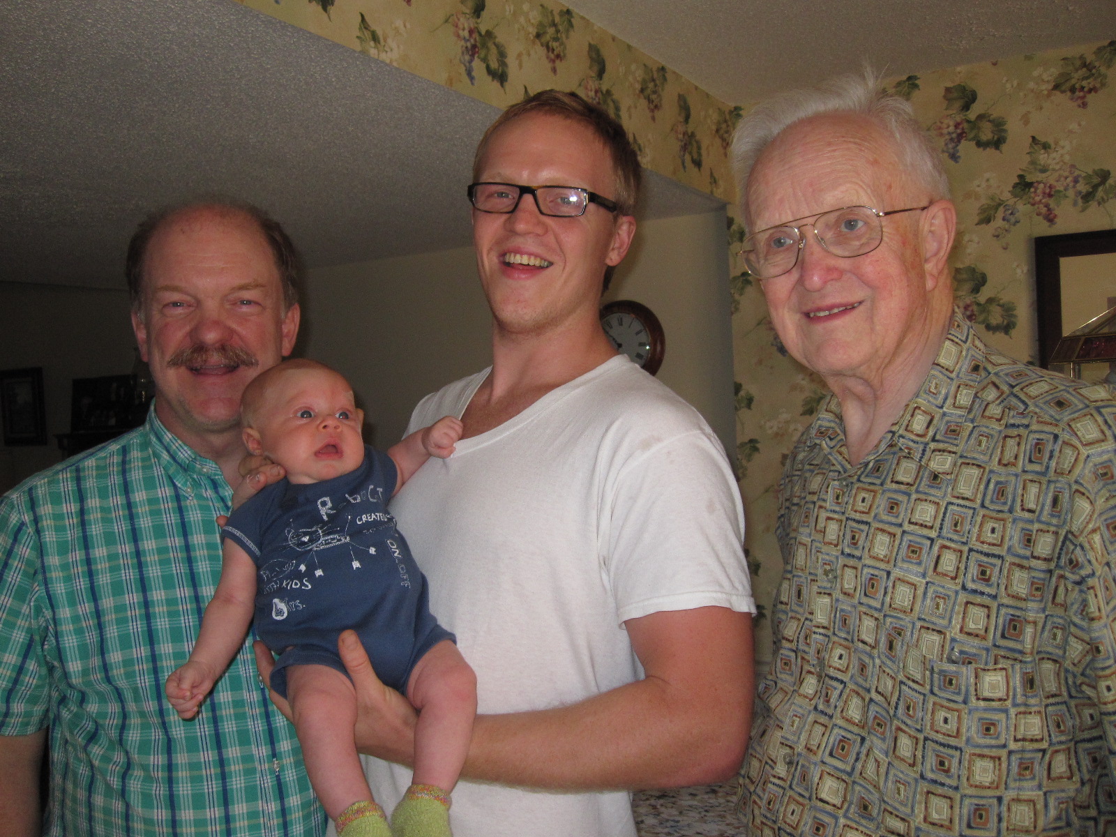 But guess what. Little Rider’s Blessed Burden is even bigger than that, a reality we celebrated, savored, and photographed a few weeks ago. Not only is Rider a child and a grandchild, a nephew and a cousin, he is also a great-grandchild. As if the lore, the tales, the actions and events and history and genes of two generations weren’t enough, there’s more. Weave in everything that great-grandparents (the parents of this rambling grandfather) add to the mosaic. Now we’re looking at Rider and wondering if his nose isn’t perhaps like his great-grandmother’s, or maybe his forehead, his great-grandfather’s. And what started out as the large book’s worth of his parents stories and expanded to a several volume set with the grandparent’s stories, now has become several shelves of stories and lore and names and dates and places and joys and sorrows and births and deaths and on and on.
