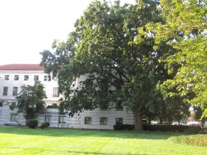 Take a look at the trees on this block. Two massive oaks, my favorites on the whole street, flank the OAS Annex. The one on the right (the west facing side) is almost half as wide or more as the building itself. The broad spreading branches of that tree have seen (and survived) their share of history. I have wanted to sit on the ground under its shade though I suspect I would not be permitted, even though no fence surrounds the yard. Venerable and notable, these ancient trees look as if they could be sentient, self-aware and able to communicate with each other like in ancient myths and modern movies. At the western end of the south side of the block sits a group of stocky old oaks. Not as broadly massive as the flanking oaks, they too feel aged and wise. I wonder, did I hear a woody whisper just now?