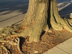 Willow oaks line the north side of the street. You can recognize them by their slender, willowy leaves. One of those great trees sits toward the western end of this block along the sidewalk on the northern (odd little park) side of the street. What I love are the massive roots, huge hunks of oaken weightiness, spilling out on the sidewalk and curb around it. You can see many examples of thick, old roots along Virginia; this is one of the first. I hope the city’s tree tenders leave it for a good long time. I worry if it breaks out of its bounds too much, doesn’t mind it’s business in its own space, doesn’t toe the line, it might get uprooted and replaced by some sleek young whipper-snapper of a tree with youthful grace but none of these splendid specimens’ gravitas.
