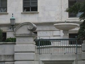 Bolivar faces the south side of Virginia Avenue where the the Organization of American States Headquarters’s homely little sister, the OAS Annex, sits. Since this building fronts Constitution Avenue, you see its modest but attractive backside from Virginia. Not half as grand as the main OAS building, I like that it looks so Latin, a villa with a red tile roof, a fountain on a raised, second floor porch, and decorative tops capping ornamental cornices. I can imagine being the guest of some influential local rich person in this, his grand home somewhere in Central America. His butler would lead me to the terrace and serve wine, avocados, cheese and fruit on the balcony while I await my host, the powerful and wealthy Don Amarando Buenaventura Raymundo de los Severino. Ray, as his friends call him, is about to offer me a handsome stipend and a small villa of my own to be his writer in residence, creating stories and poems to delight his family and guests. I think I’ll accept.